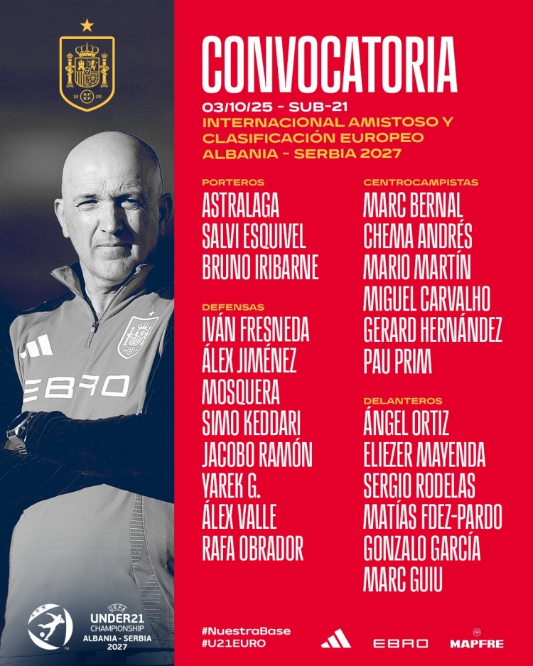 10月3日讯 西班牙足协公布U21国家队名单,西班牙U21将在10月份对阵芬兰U21和挪威U21。
