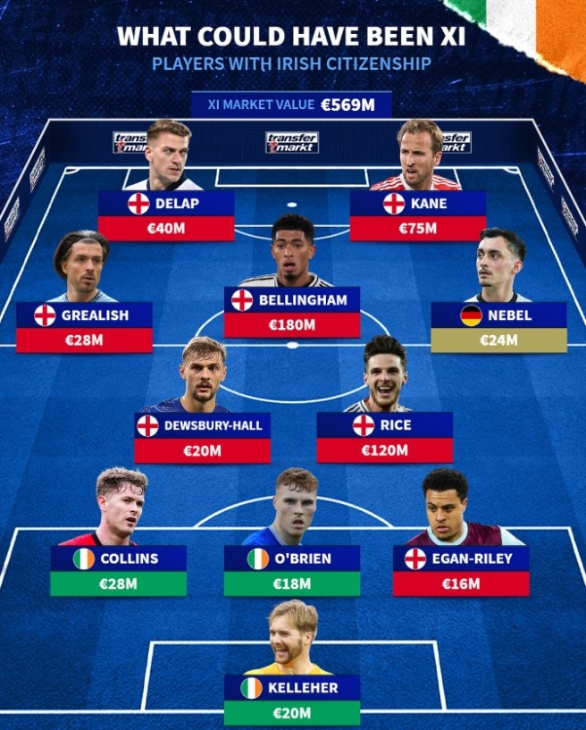 9月9日讯 英格兰球员中很多球员都是双国籍,其中有多名球员都有爱尔兰血统,这意味着他们本可以选择为爱尔兰效力。德国转会市场盘点了爱尔兰血统球员最佳阵,凯恩、赖斯、贝林厄姆、格拉利什领衔。